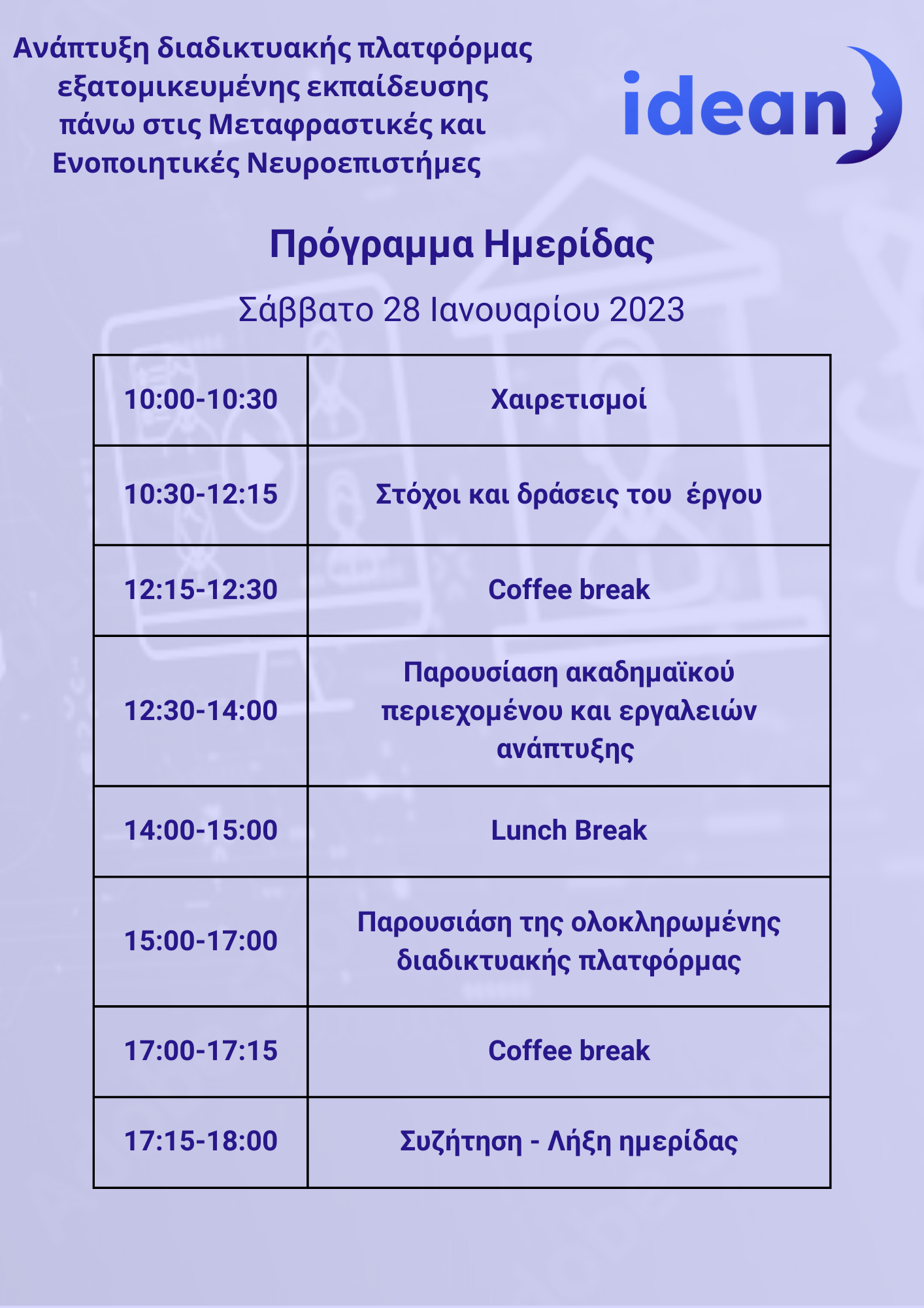 Πρόγραμμα Ημερίδας Idean Δημιουργήθηκε το πρόγραμμα της ημερίδας του έργου “Ανάπτυξη διαδικτυακής πλατφόρμας εξατομικευμένης εκπαίδευσης πάνω στις Μεταφραστικές και Ενοποιητικές